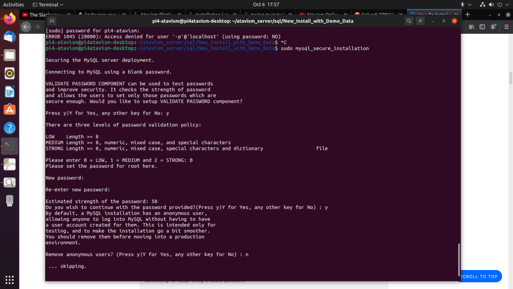 setting up mysql install sudo mysql_secure_installation should i remove the test database? sudo mysql CREATE USER 'username'@'host' IDENTIFIED WITH authentication_plugin BY 'password'; CREATE USER 'sammy'@'localhost' IDENTIFIED BY 'password'; GRANT PRIVILEGE ON database.table TO 'username'@'host'; GRANT CREATE, ALTER, DROP, INSERT, UPDATE, DELETE, SELECT, REFERENCES, RELOAD on *.* TO 'sammy'@'localhost' WITH GRANT OPTION; GRANT ALL PRIVILEGES ON *.* TO 'mahi'@'localhost'; GRANT ALL PRIVILEGES ON *.* TO 'mahi'@'%'; GRANT ALL PRIVILEGES ON *.* TO 'mahi'@'<DATABASE_FQDN>'; FLUSH PRIVILEGES; mysql: exit admin.sql atavism.sql master.sql world_content.sql In command line type: mysql -u -p <”filename.sql” – if local DB mysql -u -h -p <”filename.sql” – if remote DB looks like i need to put a username in mysql -u <username> -p <”filename.sql” – if local DB https://community.cloudera.com/t5/Support-Questions/ERROR-1045-28000-Access-denied-for-user-mahi-localhost-using/td-p/186604