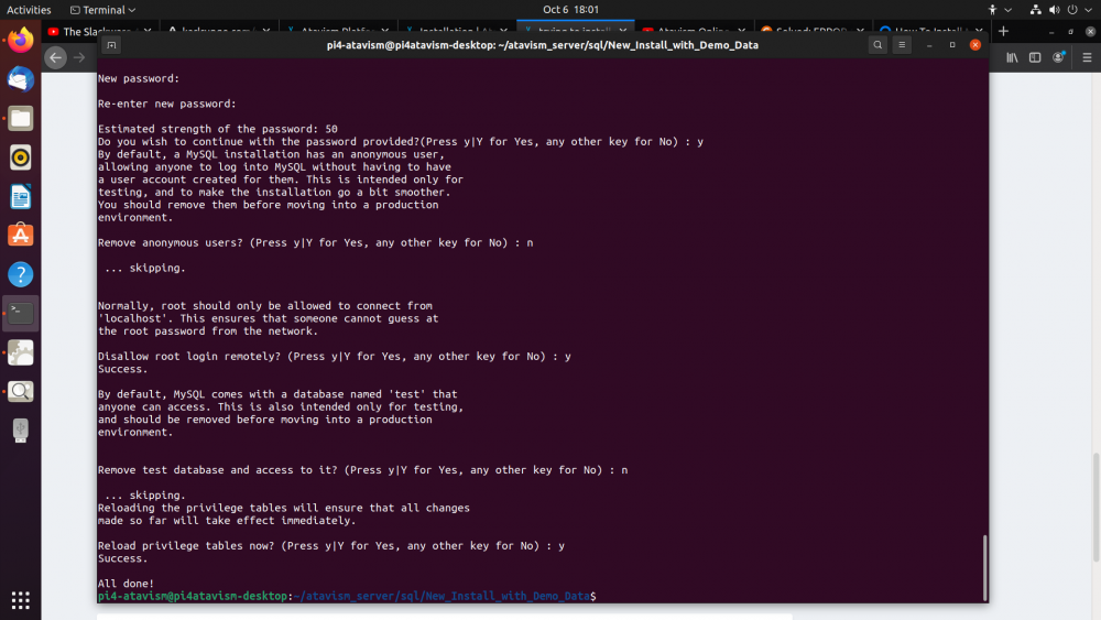 i think i solved it was a problem with <" pi4-atavism@pi4atavism-desktop:~/atavism_server/sql/New_Install_with_Demo_Data$ mysql -u ross -p admin.sql Enter password: ERROR 1049 (42000): Unknown database 'admin.sql' pi4-atavism@pi4atavism-desktop:~/atavism_server/sql/New_Install_with_Demo_Data$ ls admin.sql atavism.sql master.sql world_content.sql pi4-atavism@pi4atavism-desktop:~/atavism_server/sql/New_Install_with_Demo_Data$ mysql -u ross -p <"admin.sql" Enter password: pi4-atavism@pi4atavism-desktop:~/atavism_server/sql/New_Install_with_Demo_Data$ mysql -u ross -p <"atavism.sql" Enter password: ERROR 1045 (28000): Access denied for user 'ross'@'localhost' (using password: YES) pi4-atavism@pi4atavism-desktop:~/atavism_server/sql/New_Install_with_Demo_Data$ mysql -u ross -p <"atavism.sql" Enter password: pi4-atavism@pi4atavism-desktop:~/atavism_server/sql/New_Install_with_Demo_Data$ mysql -u ross -p <"master.sql" Enter password: pi4-atavism@pi4atavism-desktop:~/atavism_server/sql/New_Install_with_Demo_Data$ mysql -u ross -p <"world_content.sql" Enter password: pi4-atavism@pi4atavism-desktop:~/atavism_server/sql/New_Install_with_Demo_Data$