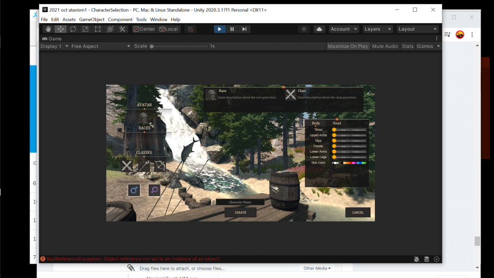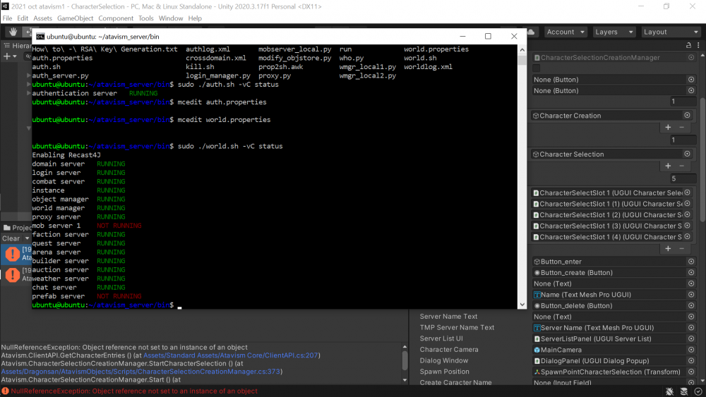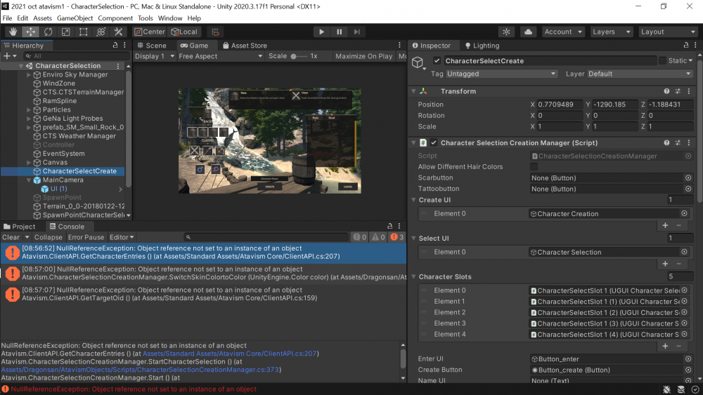 i sent the error logs but at the moment it seems to be a problem in the character selection screen with a missing reference to the character model what version of unity to you recommend for atavism 10.5? atm i am using 2020 LTS NullReferenceException: Object reference not set to an instance of an object Atavism.ClientAPI.GetCharacterEntries () (at Assets/Standard Assets/Atavism Core/ClientAPI.cs:207) Atavism.CharacterSelectionCreationManager.StartCharacterSelection () (at Assets/Dragonsan/AtavismObjects/Scripts/CharacterSelectionCreationManager.cs:373) Atavism.CharacterSelectionCreationManager.Start () (at
