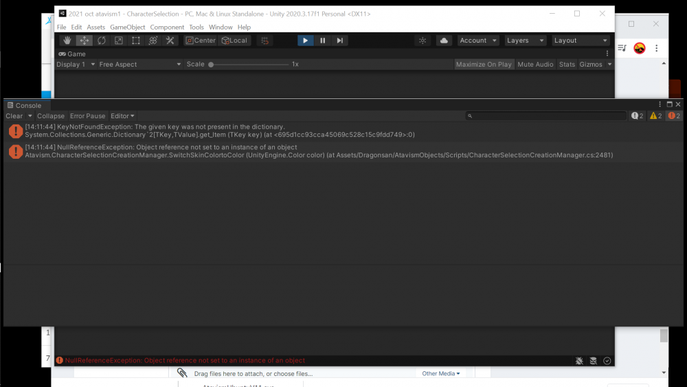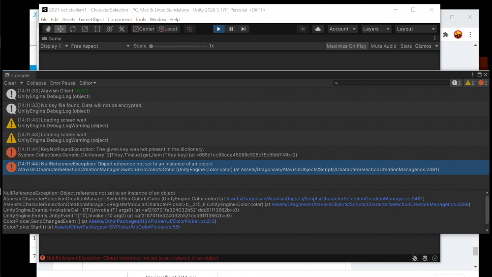 2 error messages on entering the chooser scene KeyNotFoundException: The given key was not present in the dictionary. System.Collections.Generic.Dictionary`2[TKey,TValue].get_Item (TKey key) (at <695d1cc93cca45069c528c15c9fdd749>:0) Atavism.CharacterSelectionCreationManager.StartCharacterCreation () (at Assets/Dragonsan/AtavismObjects/Scripts/CharacterSelectionCreationManager.cs:1093) Atavism.CharacterSelectionCreationManager.Start () (at Assets/Dragonsan/AtavismObjects/Scripts/CharacterSelectionCreationManager.cs:318) NullReferenceException: Object reference not set to an instance of an object Atavism.CharacterSelectionCreationManager.SwitchSkinColortoColor (UnityEngine.Color color) (at Assets/Dragonsan/AtavismObjects/Scripts/CharacterSelectionCreationManager.cs:2481) Atavism.CharacterSelectionCreationManager.<RegisterModularCharacterPicker>b__215_8 (UnityEngine.Color color) (at Assets/Dragonsan/AtavismObjects/Scripts/CharacterSelectionCreationManager.cs:3588) UnityEngine.Events.InvokableCall`1[T1].Invoke (T1 args0) (at <af218701fe324032b521ddd91f13662b>:0) UnityEngine.Events.UnityEvent`1[T0].Invoke (T0 arg0) (at <af218701fe324032b521ddd91f13662b>:0) ColorPicker.SendChangedEvent () (at Assets/OtherPackages/HSVPicker/UI/ColorPicker.cs:212) ColorPicker.Start () (at Assets/OtherPackages/HSVPicker/UI/ColorPicker.cs:58)