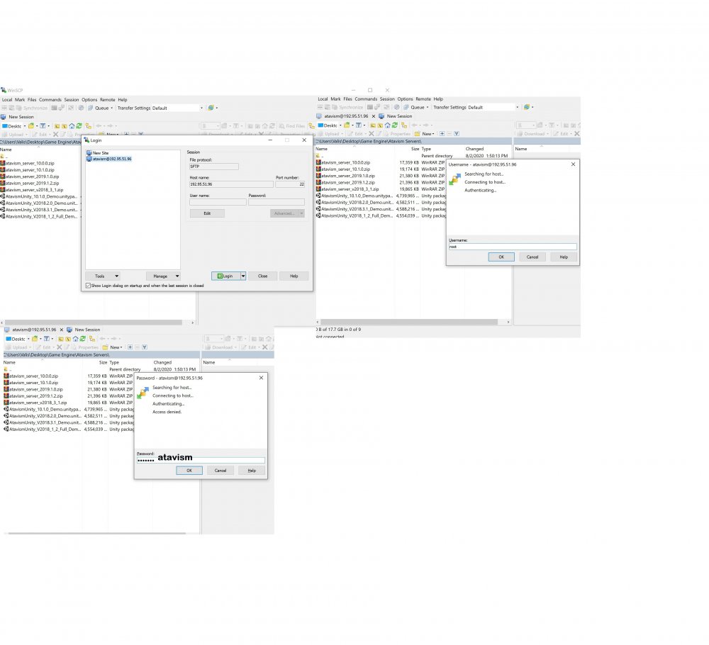 So this I think is going to be a little frustrating. Downloaded WinSCP and started following the video tutorial. I can get to the user log in part about logging into the server (Here in the video he explains if you didn't change the password - I did not) and I keep connecting with user (root) pass (atavism) and access is denied. So there's that.. I tried the password from Apanel>AtavismClould>Server> user / pass Denied access again. I've attached a Screen shot. New_Bitmap_Image_(2).bmp -